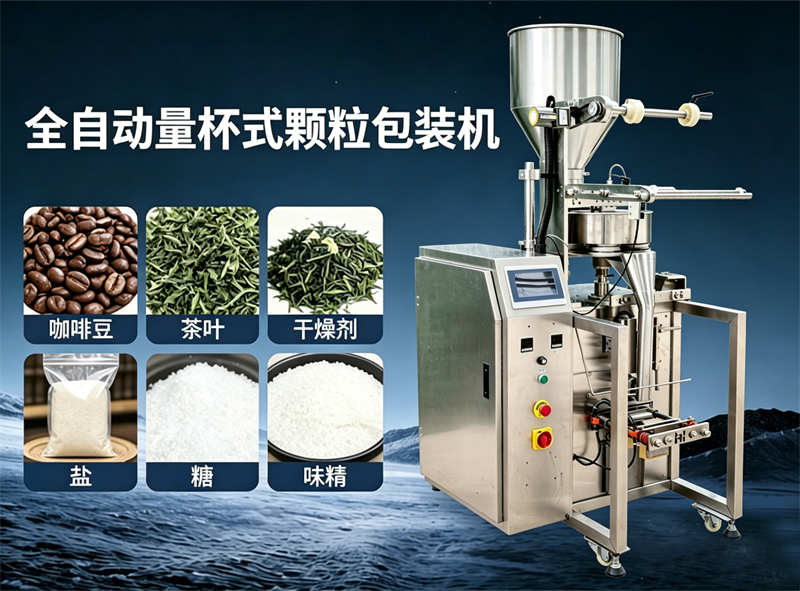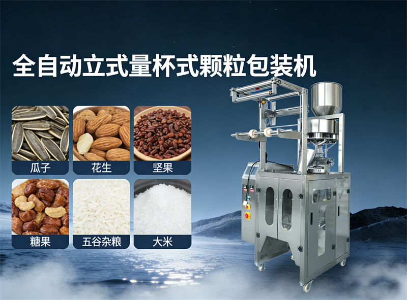 这是一台全自动立式量杯式颗粒包装机,是集自动送膜、制袋成型、定量计量、物料充填、热封封口、切断计数、日期打印于一体的一体化智能包装设备。专为流动性好的颗粒状、小颗粒物料设计,完美解决颗粒包装 “计量不准、人工效率低、包装不规范” 的行业痛点,广泛应用于食品、医药、日化、化工等行业,是颗粒类产品规模化生产的核心包装设备。