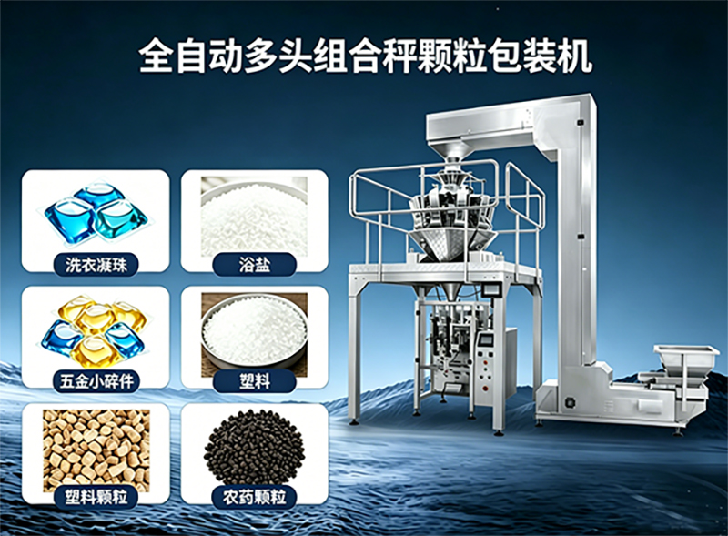 这是一套全自动多头组合秤立式颗粒包装生产线,是集自动上料、高精度称重计量、制袋成型、充填封口、成品输出于一体的一体化智能包装系统。专为不规则颗粒、块状、混合物料设计,完美解决不规则物料 “计量不准、人工效率低、包装不规范” 的行业痛点,广泛应用于食品、日化、医药、化工等行业,是中大型食品加工厂、零食企业规模化生产的核心包装设备。