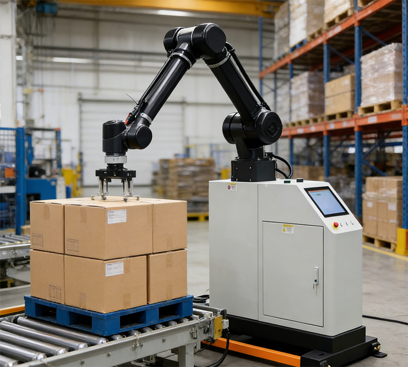 这是一台四轴协作式码垛机器人(也叫协作码垛机、桌面式码垛机械手),是后段包装生产线的核心自动化设备,专为中小批量、多品类生产场景设计,可自动完成产品抓取、搬运、码垛全流程,替代人工码垛,大幅提升后段包装效率,是食品、日化、医药、电商等行业实现码垛自动化的高性价比选择。