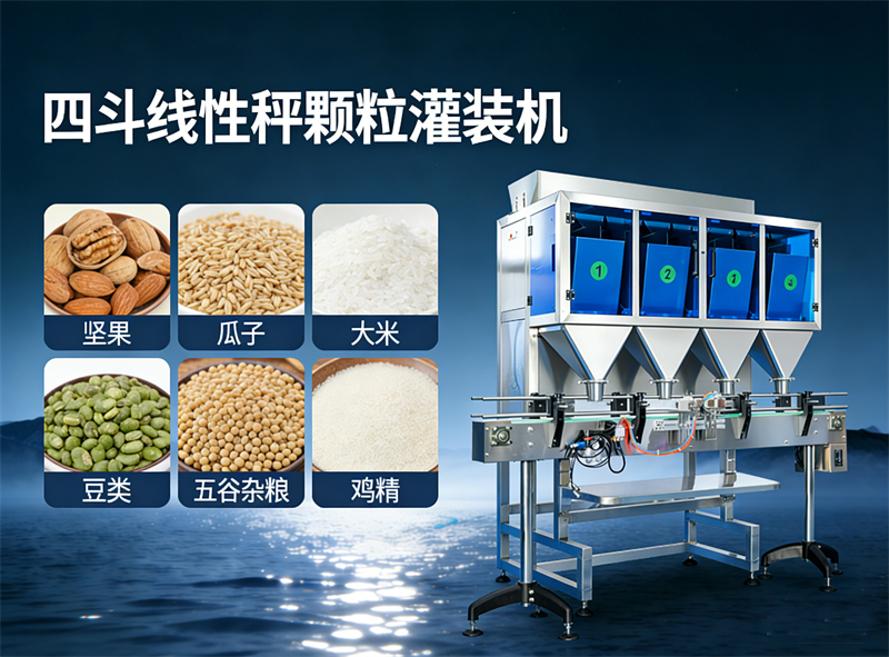 这是一台全自动四斗线性秤颗粒灌装机,是专为颗粒状物料设计的高精度、自动化定量灌装设备,广泛应用于食品、粮油、宠物用品、医药、五金等行业,是瓶装 / 罐装颗粒物料生产线的核心灌装设备。